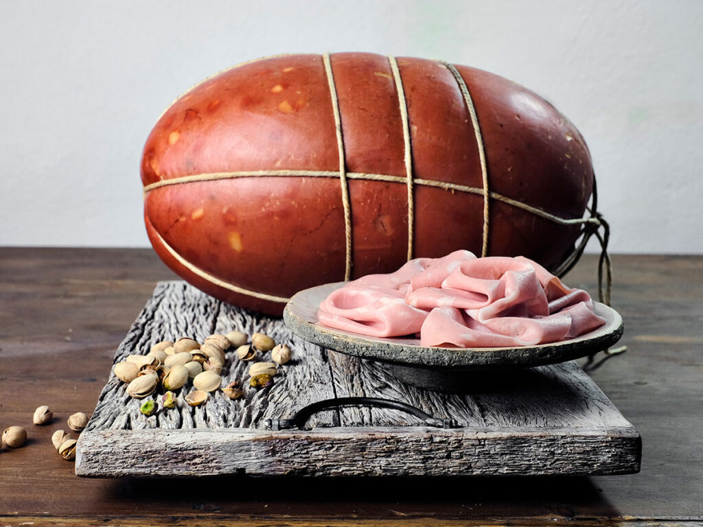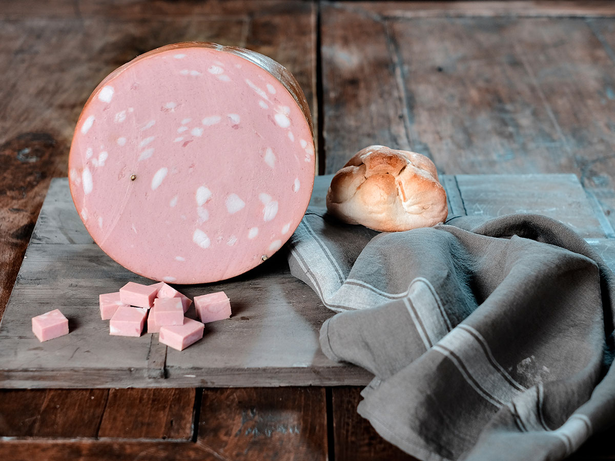Typical are also the appearance and the colour of the slice as well, a uniform pink due to finely minced meat studded with well-defined white cubes, the so-called “lardelli” (first quality fat).