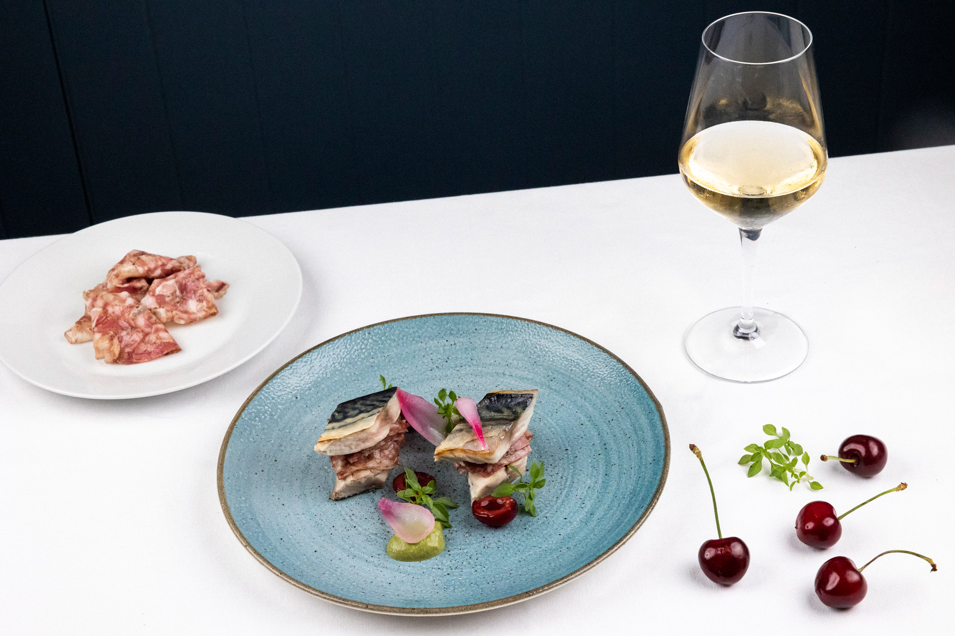 MACCARELLO SCOTTATO, INSALATA DI CIPOLLE E CILIEGIE MARINATE, COPPA AFFUMICATA ALL’ ALLORO