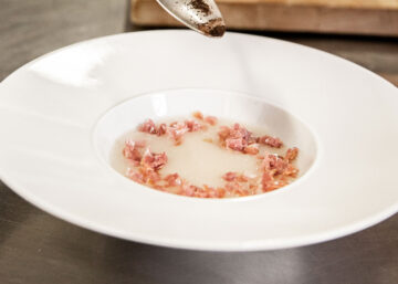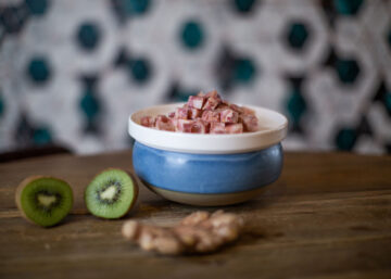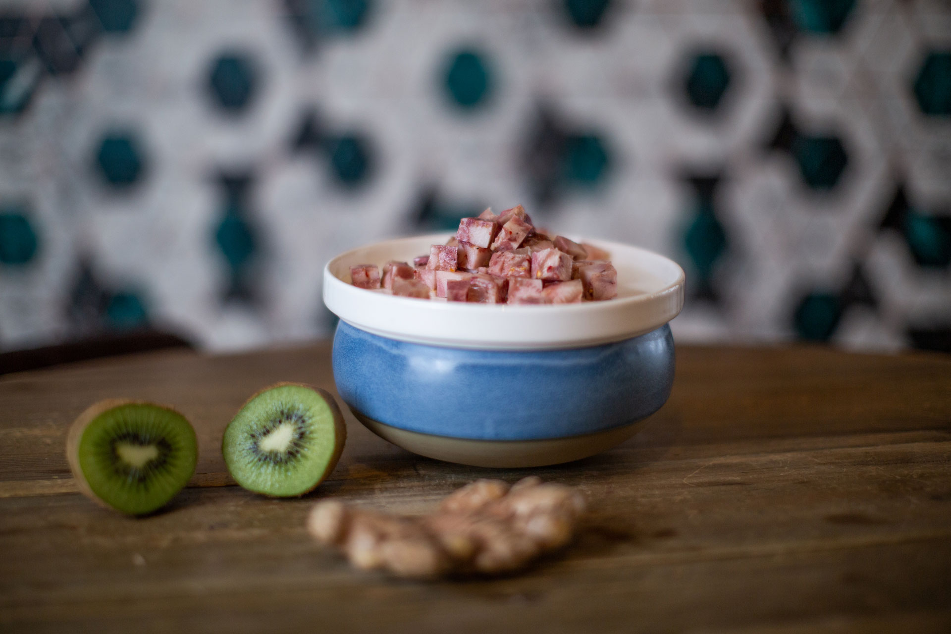 Adagiare sul fondo del piatto la coppa di testa, grattugiare lo zenzero, aggiungere le foglie di misticanza condite con aceto di lamponi e completare con la granita di kiwi e una spolverata di pepe nero.