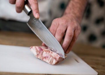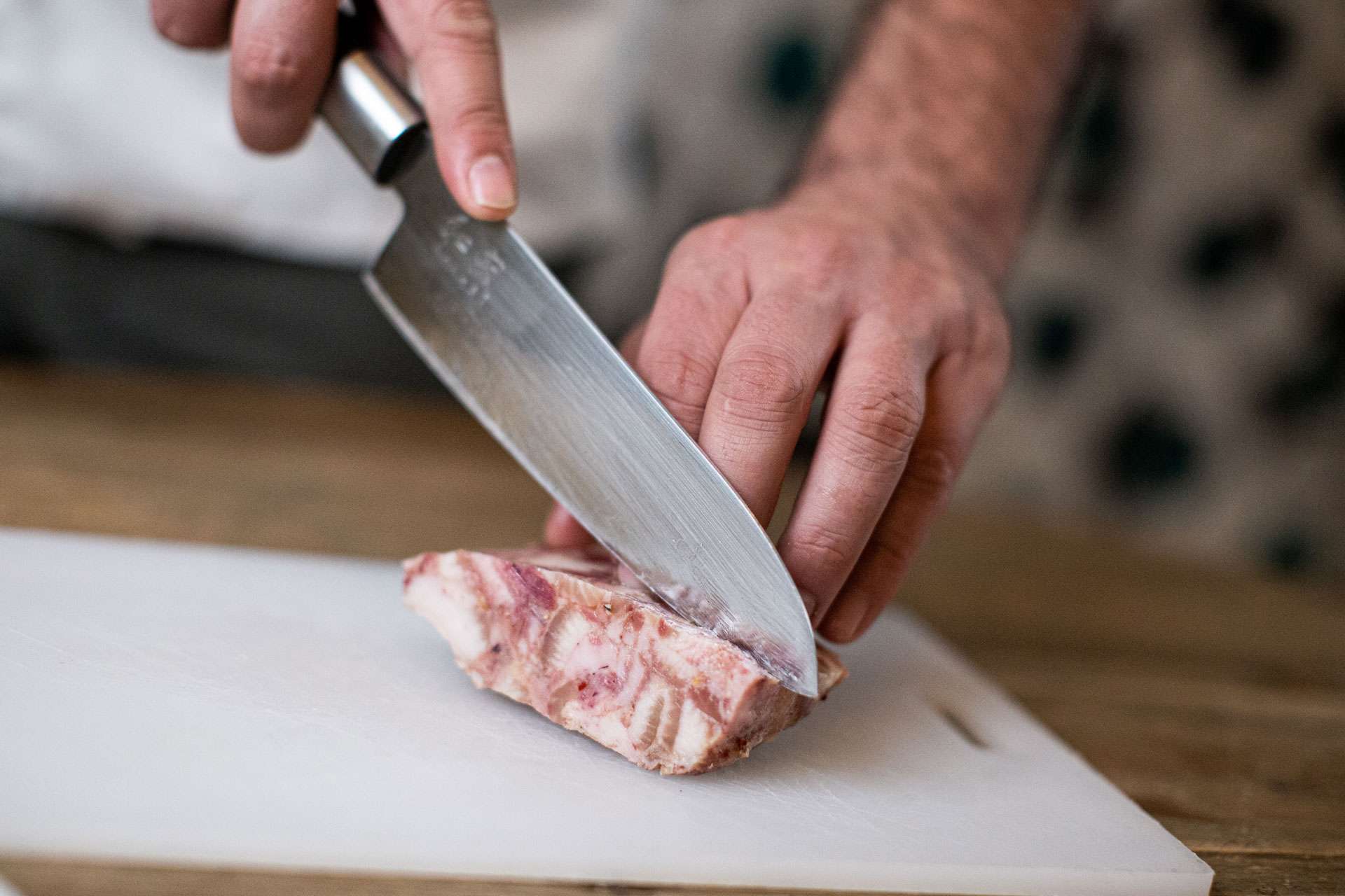 Tagliare la coppa di testa a cubetti, circa 5mm per lato, cuocerla sulla brace (o su una piastra di ghisa) per circa 2 minuti.