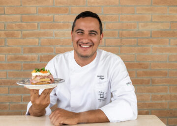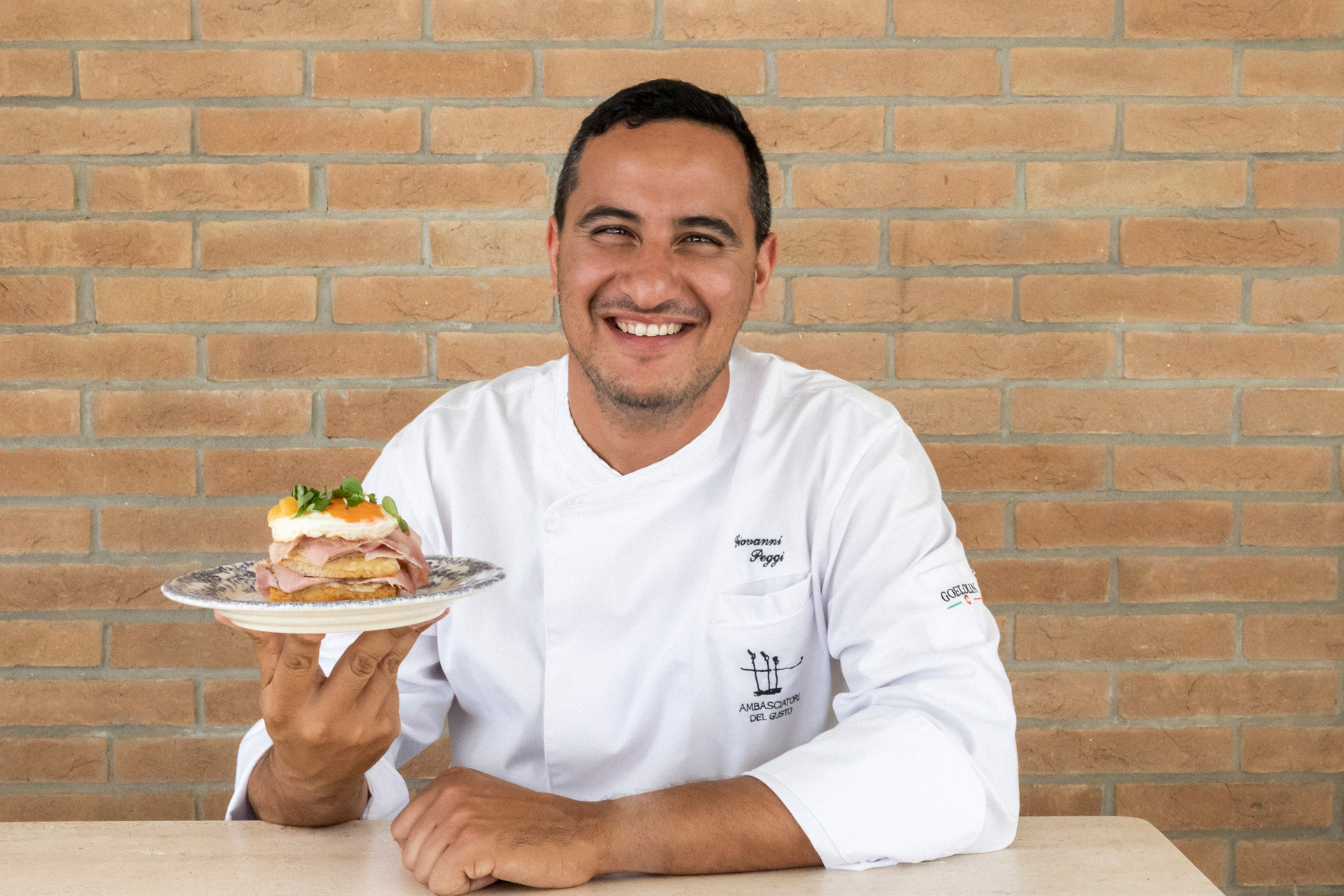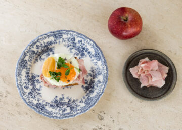 Prendere i due crostoni di pane con la fontina sciolta e aggiungervi sopra delle fette di prosciutto cotto arrosto. Posizionare il secondo strato di pane sopra, sempre con la fontina sciolta, e chiudere lo strato con il prosciutto cotto arrosto. A questo punto adagiare l’uovo cotto in tegamino e la composta di mele cotogne.
