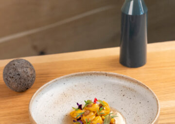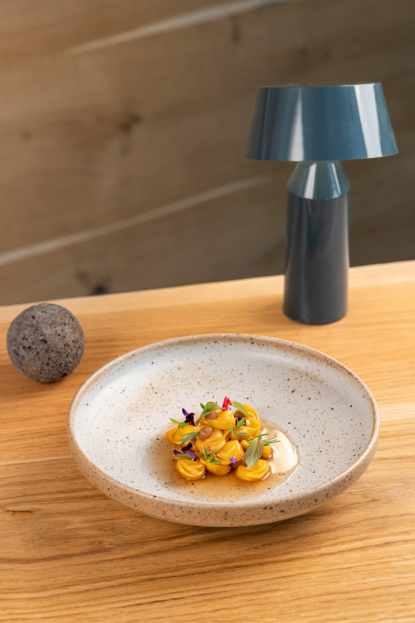 Tortellini di trota affumicata e culatello, consommé di mele, salvia all’ananas e lavanda.