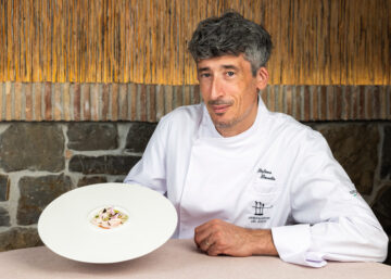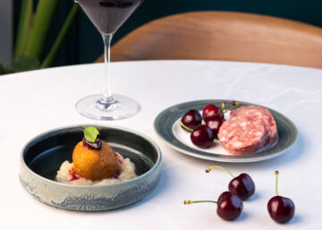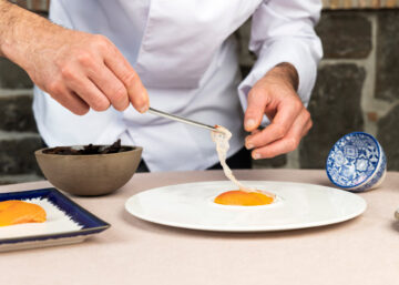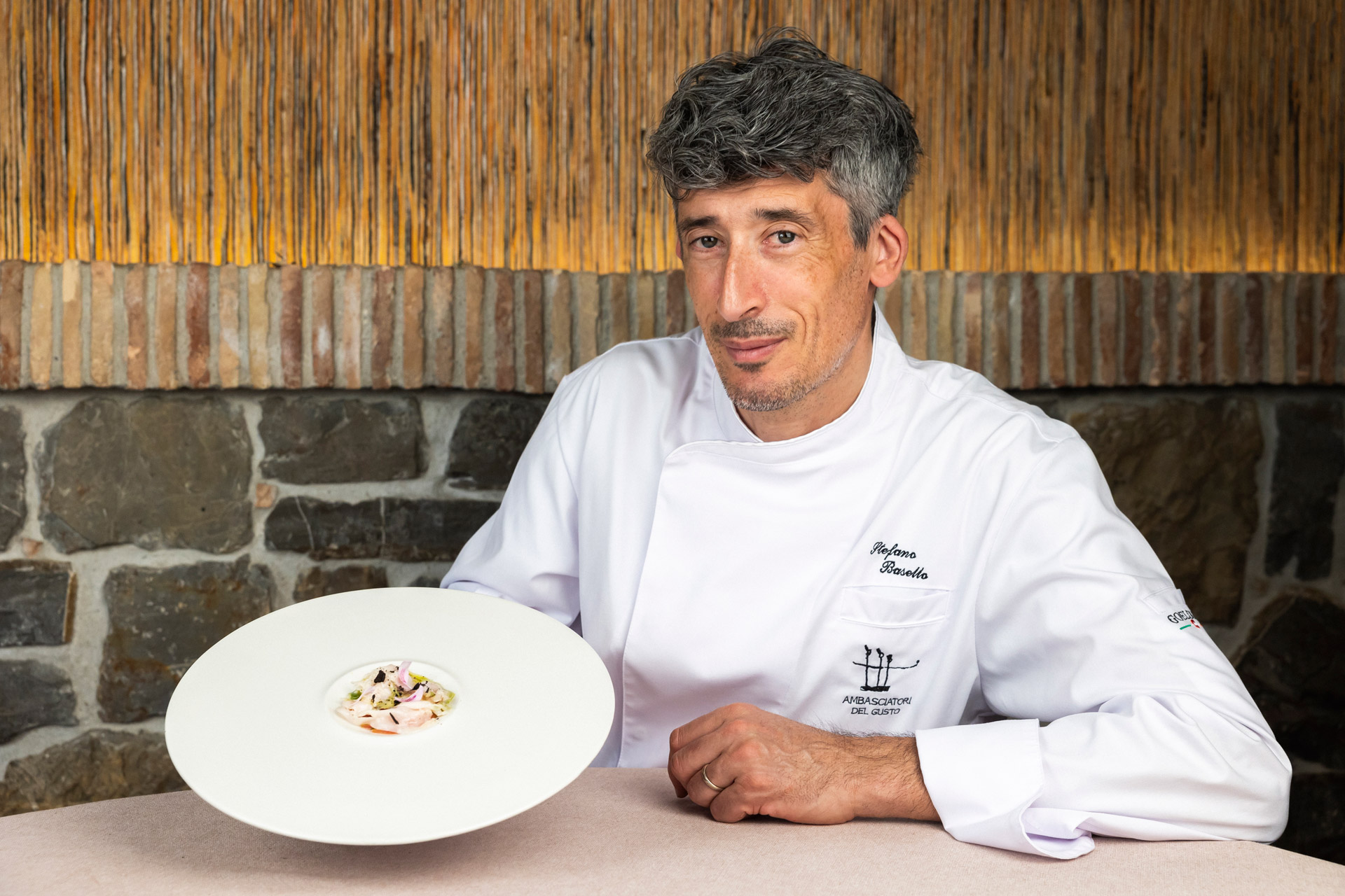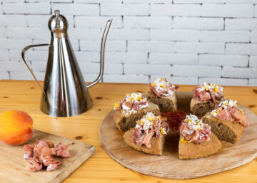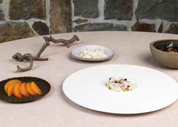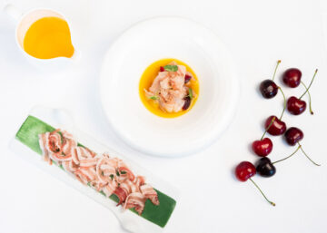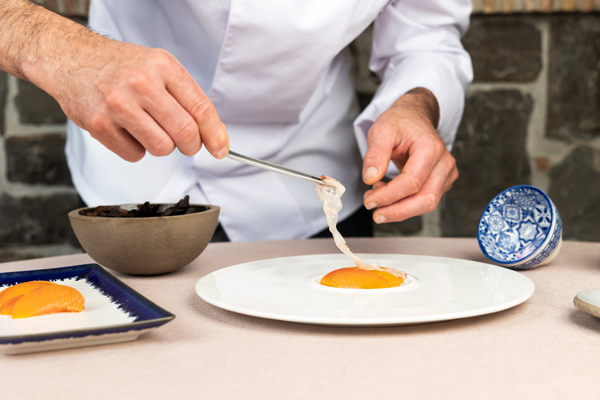 Pesche marinate con petali di cipolla croccante e “velo” di lardo fiammeggiato.