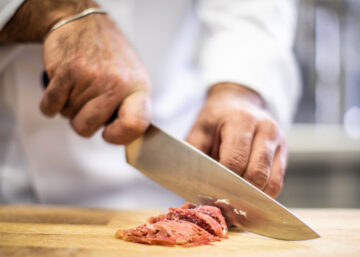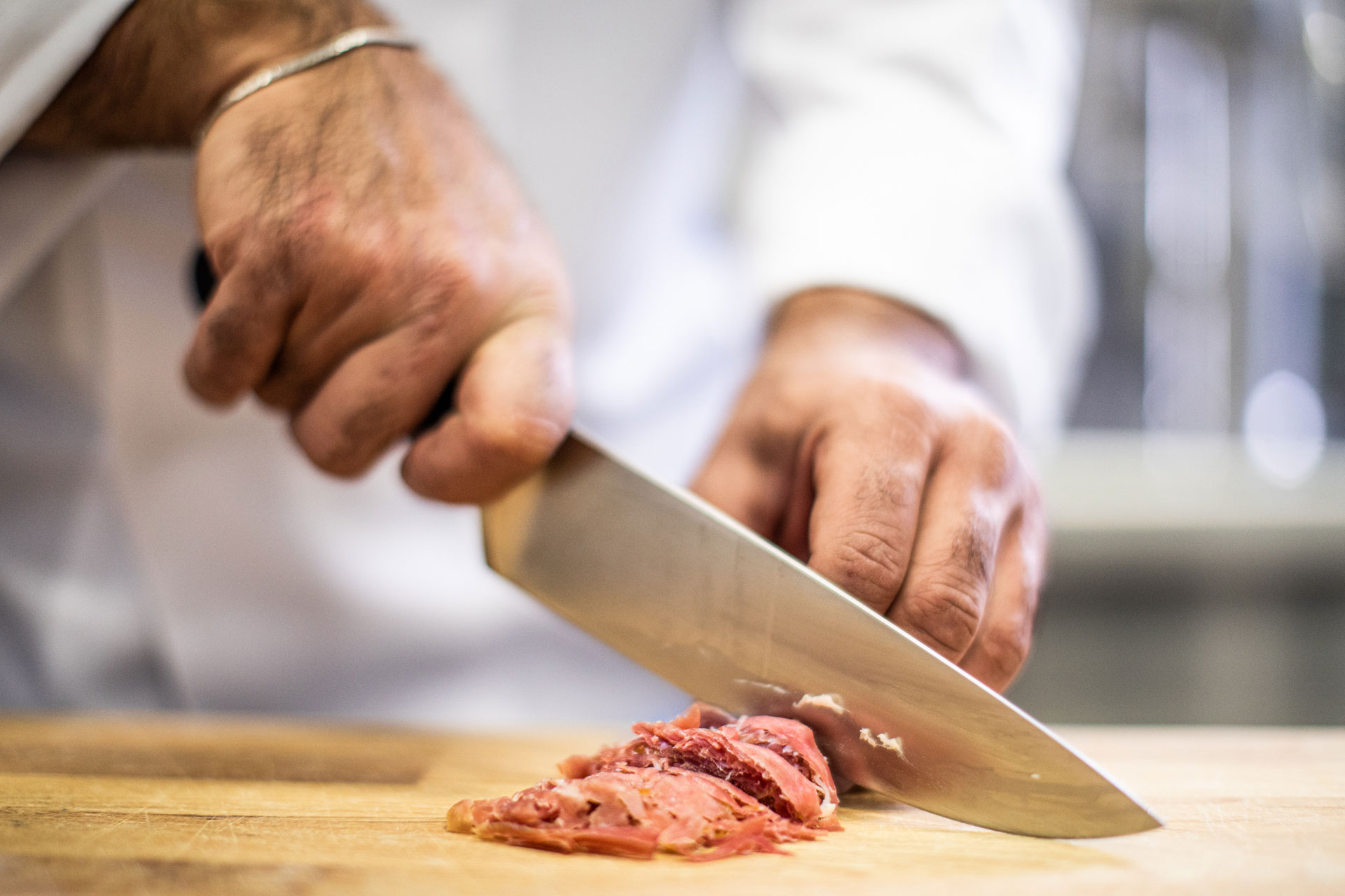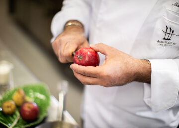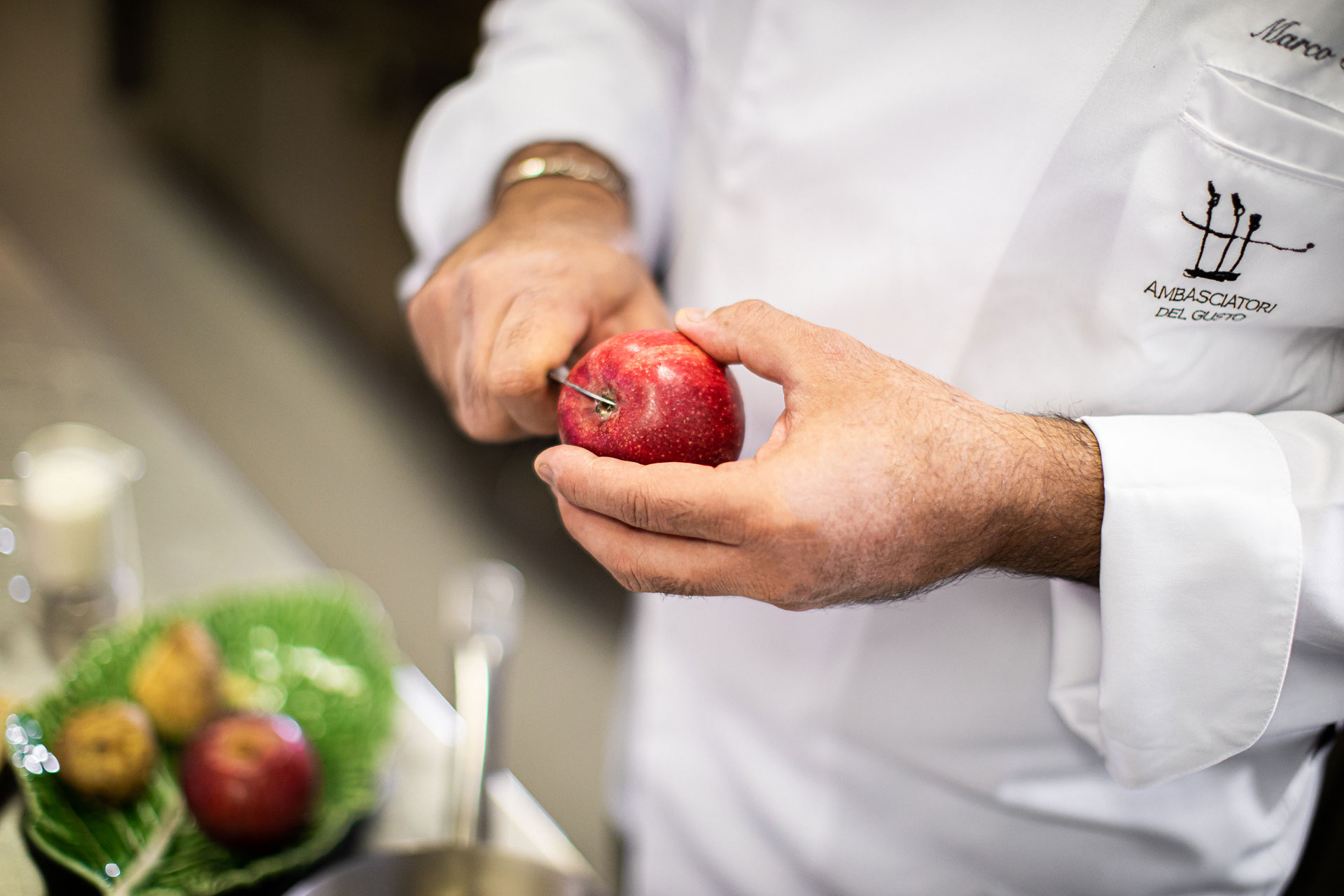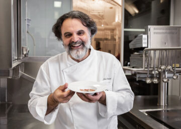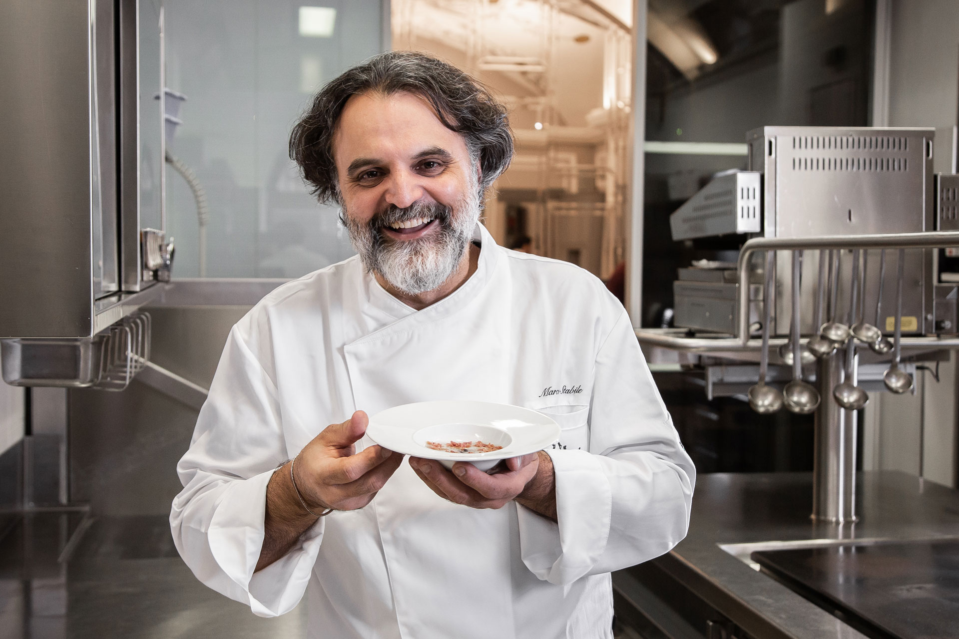 Aggiungere a corona il prosciutto tagliato in micro cubi e finire con un pizzico di polvere di liquirizia.