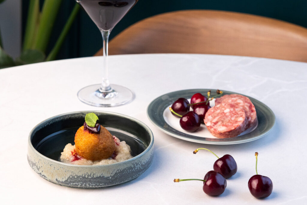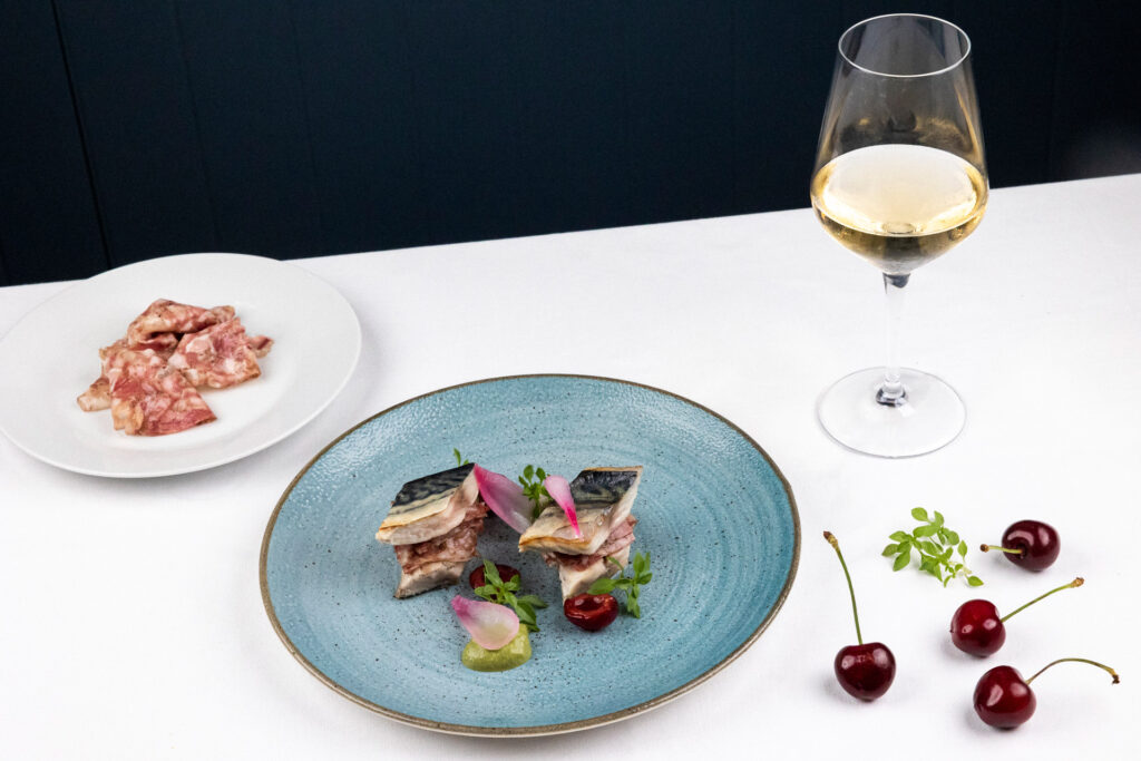 MACCARELLO SCOTTATO, INSALATA DI CIPOLLE E CILIEGIE MARINATE, COPPA AFFUMICATA ALL’ALLORO