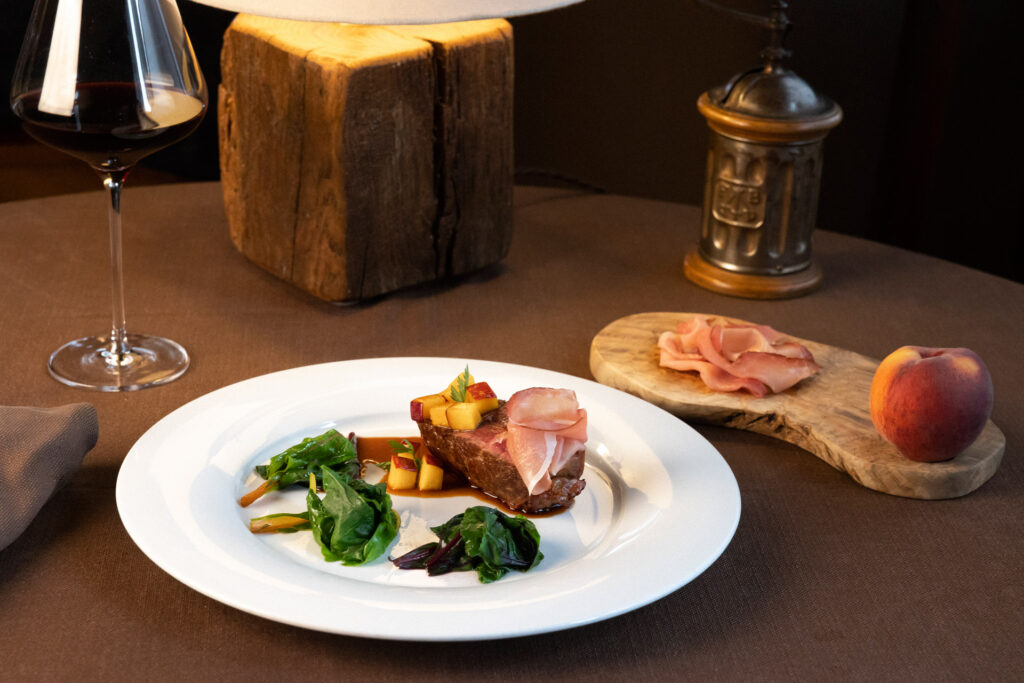 LOMBO DI MANZO AL BBQ, SPECK, BIETOLA DELL’ORTO E PESCHE IN SALSA DI MOSCATO