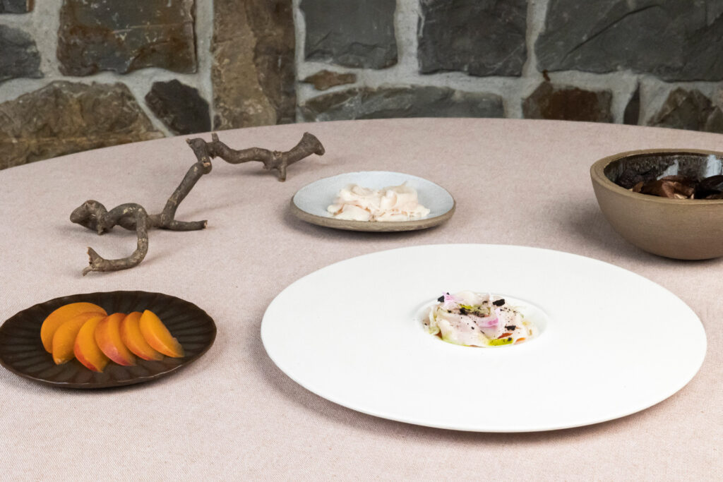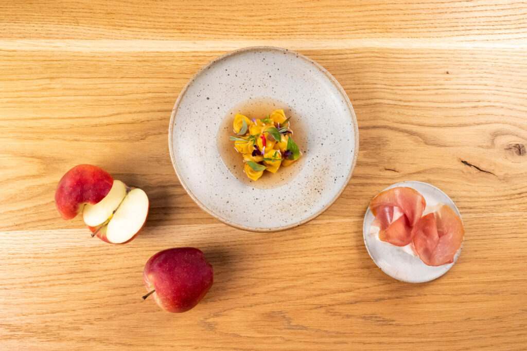 RICCIOLA, GRASSO DI PANCETTA, CILIEGIE FERMENTATE E BRODO FREDDO DI ZAFFERANO